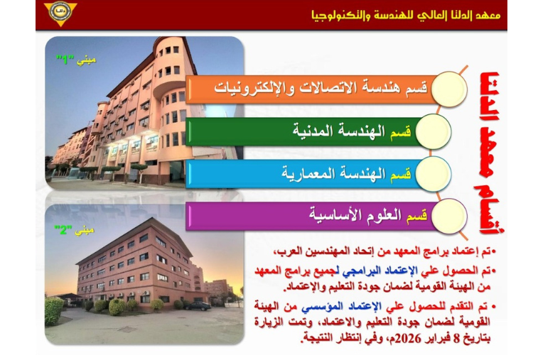 يهدف معهد الدلتا العالي للهندسة والتكنولوجيا إلى إعداد مهندسين مؤهلين يمتلكون المعرفة العلمية والمهارات العملية التي تمكنهم من مواكبة التطورات المتسارعة في المجالات الهندسية المختلفة. يوفر المعهد برامج تعليمية حديثة تعتمد على الجمع بين الدراسة النظرية والتطبيق العملي داخل المعامل المتطورة. كما يحرص المعهد على تنمية قدرات الطلاب في الابتكار والتفكير الهندسي، مما يؤهلهم للمساهمة بفاعلية في تنفيذ المشروعات الهندسية ودعم مسيرة التنمية والبناء في المجتمع.